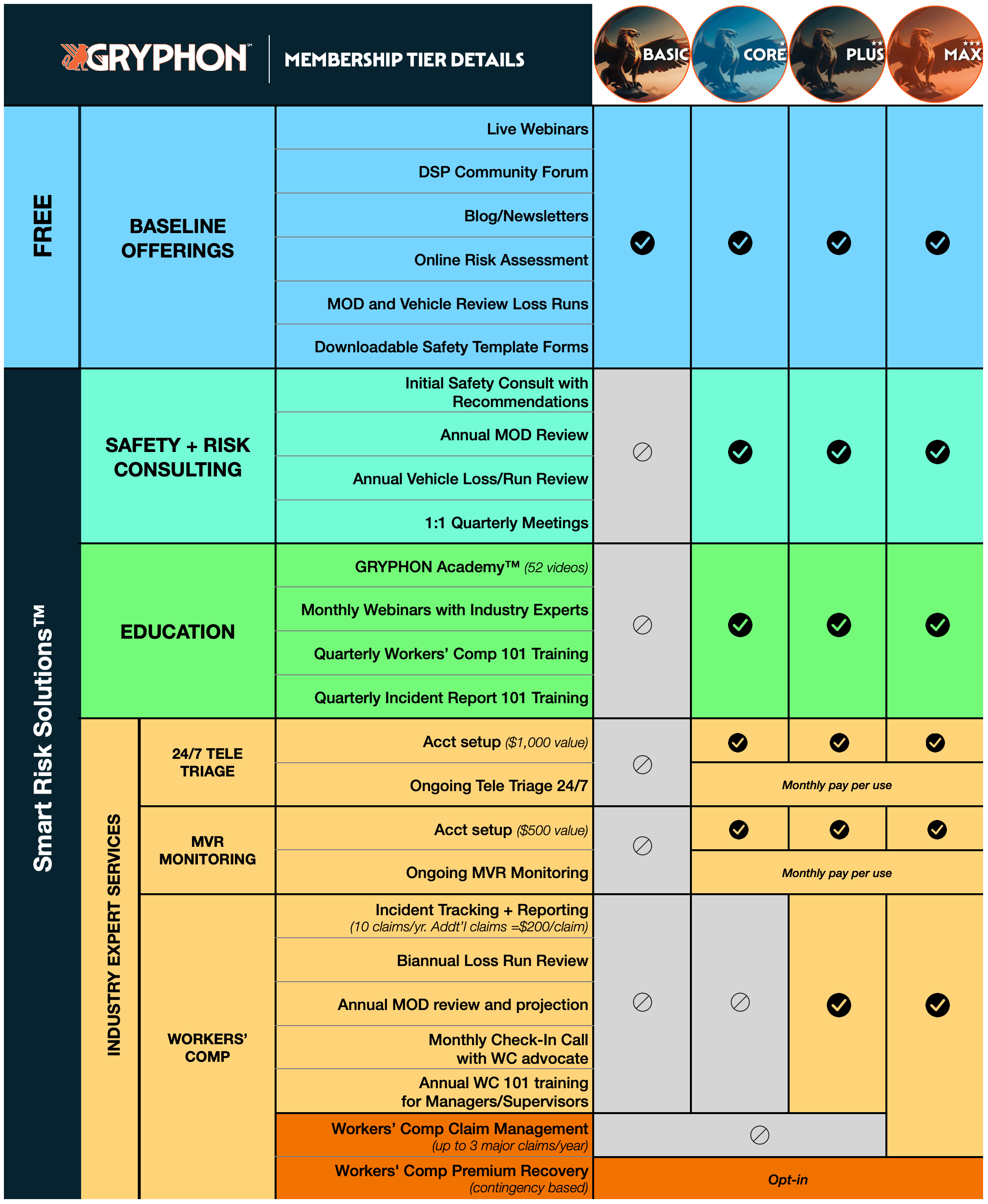The CORE membership's annual flat-rate includes Consulting, Educational Resources, and Industry Expert Support—a complete risk management package. It also covers setup fees for MVR Monitoring ($500 value), GRYPHON Academy LMS setup ($500 value), and Tele Triage ($1,000 value).